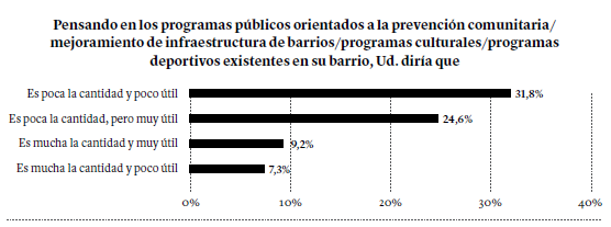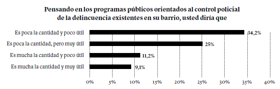 Con respecto a la percepción de los programas públicos orientados al control policial de la delincuencia en el barrio, 34,2 % de los encuestados opina que es poca la cantidad y poco útil, seguido de 25 % que afirma que es poca la cantidad, pero muy útil. Entonces, al igual que la oferta pública de programas comunitarios, la opinión de los encuestados con respecto a los programas de control policial de la delincuencia apunta mayoritariamente a su baja cobertura (Figura 5).