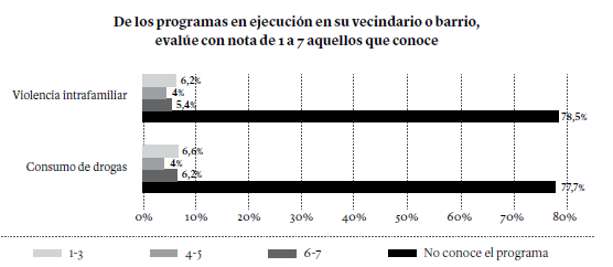 Con respecto a los programas de prevención de consumo de drogas y de atención a la violencia intrafamiliar, es llamativo que casi el 80 % de los encuestados dice desconocerlos, pese a que son problemáticas percibidas como graves por los entrevistados. Junto a ello, y con respecto a la evaluación de aquellos que los vecinos sí conocen, las diferencias entre los rangos de notas no son estadísticamente significativas, por tanto, la valoración de ambos programas no logra ser concluyente (Figura 4).