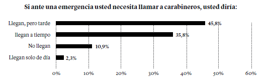 Dada la mala evaluación que hoy recibe la policía de Carabineros a nivel nacional, y la falta de legitimidad social con que ella cuenta, es difícil interpretar este dato como fuente de confianza. Más bien, lo que debe preocupar es que para las personas la policía sigue simbolizando un espacio de protección frente a amenazas o daños, especialmente cuando se habita en barrios de alta vulnerabilidad sociodelictual.