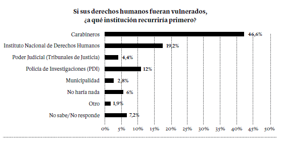 Pero también la percepción negativa respecto al desempeño policial en estos barrios es preocupante, en tanto las personas siguen pensando que la policía es la principal institución de protección frente a la vulneración de derechos. Como muestra la Figura 6, 46 % de los encuestados en nuestro estudio reporta que recurriría a Carabineros si sus derechos fueran vulnerados.