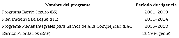 Esta realidad es la que ha llevado al Ministerio de Interior y Seguridad Pública a implementar el actual programa de Barrios Prioritarios, en el cual se busca dar respuesta multiagencial a los factores que están en el origen del problema. Sin embargo, y como hemos mencionado antes, esta iniciativa no es novedosa, en tanto responde a un tipo de estrategias de larga trayectoria en el país. Y es que, del año 2000 en adelante, la política de seguridad en Chile se ha focalizado en el ámbito de control y prevención del delito en los territorios urbanos populares fomentando la participación activa de la ciudadanía y su involucramiento en actividades e iniciativas de diagnóstico de problemas, recuperación de espacios públicos, conformación de sistemas de vigilancia vecinal, organización de mesas barriales de coordinación con los municipios, entre otras (Trebilcock; Luneke, 2018), y programas integrales de trabajo multiagencial que se han focalizado en aquellos barrios con mayores niveles de prevalencia socio delictual. Dentro de este último ámbito de acción, se destacan tres experiencias, que se han implementado consecutivamente en los barrios a nivel nacional y que son objeto de nuestro análisis: Barrio Seguro (2000- 2009), Plan Iniciativa Legua (2010-2014) y Planes Integrales para Barrios de Alta Complejidad (2015-2018).