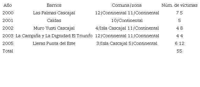 Los paramilitares, además, tuvieron vínculos con políticos e hicieron tratos con agentes del Estado -especialmente con miembros de la fuerza pública-, lo cual les permitió obtener información de inteligencia, coordinar conjuntamente incursiones y contar con apoyo logístico en el transporte, generando el afianzamiento de un control territorial y poblacional dentro de la ciudad (CNMH, 2015; Buenaventura, la “joya”…, 2013). De 2000 a 2005, ocurrieron varias masacres en la parte urbana de Buenaventura (ver Cuadro 1), en su mayoría cometidas por los paramilitares del Bloque Calima. Solo una de ellas se le atribuye a las FARC-EP, en los barrios La Campiña y La Dignidad de la Comuna 12.