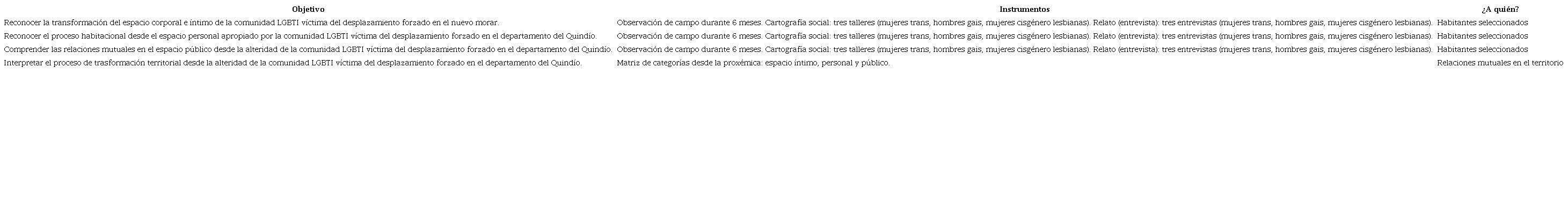 La unidad de análisis son las relaciones mutuales evidenciadas en la transformación territorial desde el espacio íntimo, personal y público. La unidad de trabajo son los habitantes del departamento del Quindío miembros de la comunidad LGBTI y víctimas del desplazamiento forzado, quienes han modificado el territorio desde su habitar.