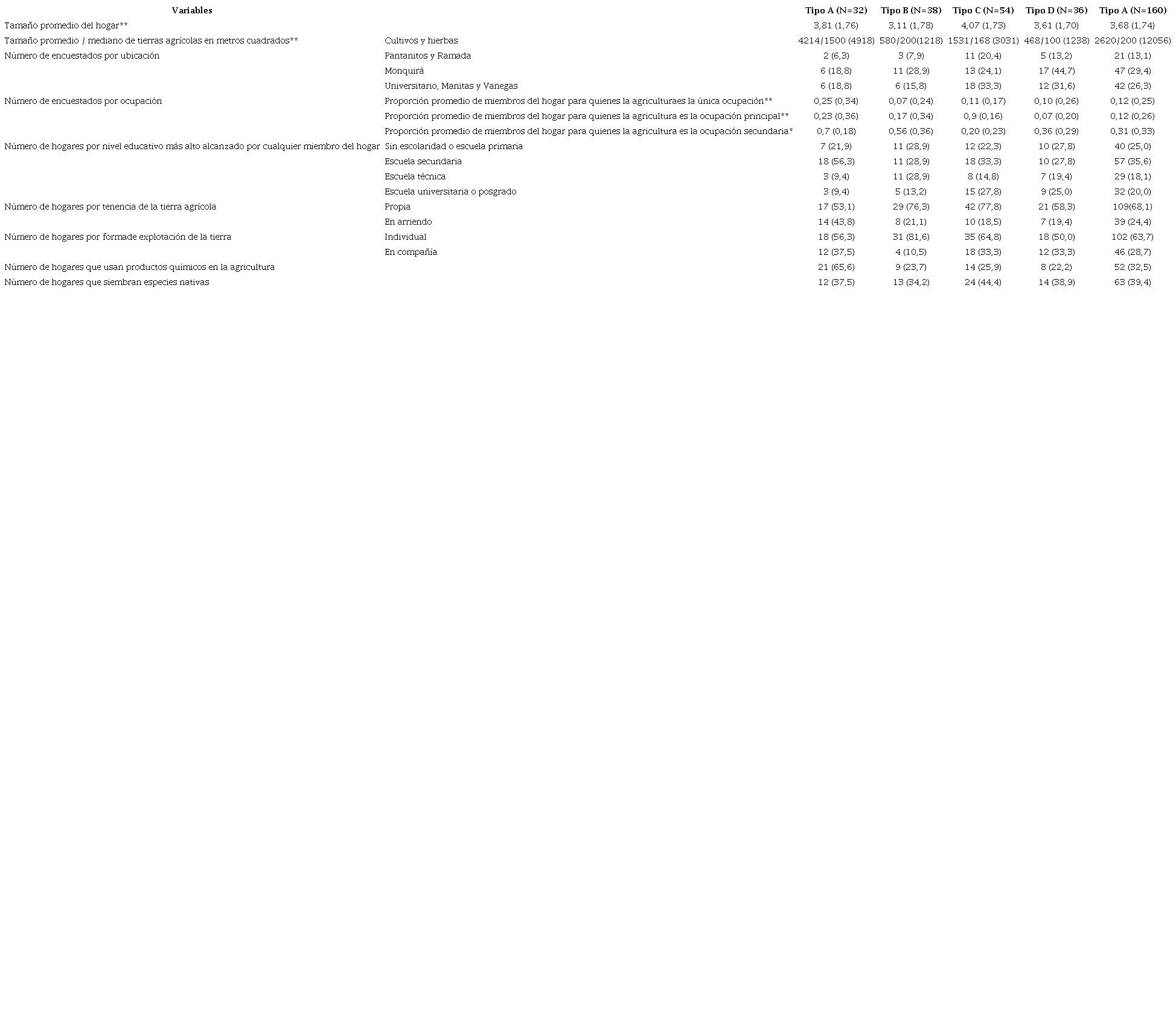 El tipo A (N=32) comprende hogares de agricultores comerciales para quienes la dependencia del ingreso en la agricultura es igual a 75 % o más, independientemente del porcentaje de miembros del hogar que trabajan en la agricultura. El tipo B (N=38) se compone de hogares para los cuales la dependencia del ingreso por la agricultura es más de 0 % pero menos de 75 %, y más de 50 % de los miembros están involucrados en la agricultura. El tipo C (N=54) representa hogares para los cuales la dependencia del ingreso por la agricultura es más de 0 % pero menos de 75 %; sin embargo, menos de 50 % de los miembros están involucrados en la agricultura. Finalmente, el tipo D (N=36) comprende hogares para los cuales el ingreso no depende de la agricultura, independientemente del porcentaje de miembros del hogar que participan en dicha actividad. Trece casos fueron excluidos del análisis porque los datos con respecto a una o ambas de las dos variables mencionadas anteriormente no estaban disponibles.
