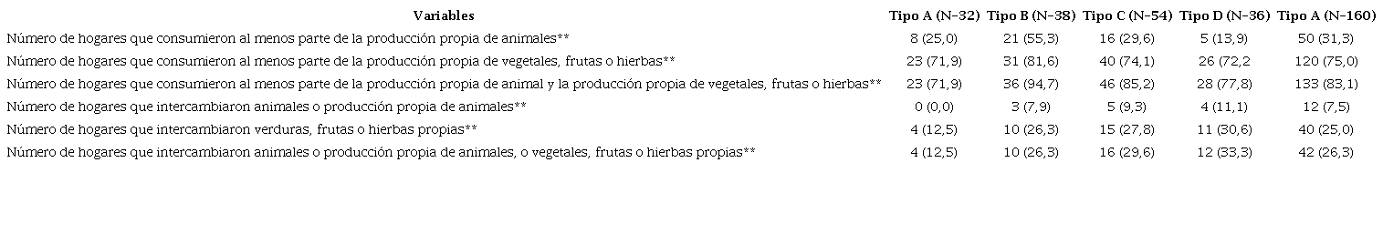 Las prácticas del AIDE evidenciaron que 83,1 % de los hogares encuestados (respuestas válidas) consumían al menos parte de los alimentos de producción propia (ya sea productos animales o vegetales/frutas/hierbas). El porcentaje de autoconsumo era mayor entre los hogares dedicados únicamente a la producción de vegetales/ frutas/hierbas. Los porcentajes eran muy altos en todos los tipos de hogares; sin embargo, fueron más altos entre los tipos de hogar B, C y D que en los del tipo A, los cuales se dedicaban más a la producción de alimentos con fines comerciales (Cuadro 3). La proporción mediana de los alimentos consumidos dentro del hogar con respecto al total de alimentos producidos oscila entre 0,5 y 1 entre los cuatro tipos. Los hogares de los tipos C y D mostraron las tasas más altas de autoconsumo. De este modo, mientras que 38 % de los hogares que presentaron autoconsumo de todos los alimentos por ellos producidos pertenecían al tipo D, 32,1 % pertenecían al tipo C (Cuadro 3).