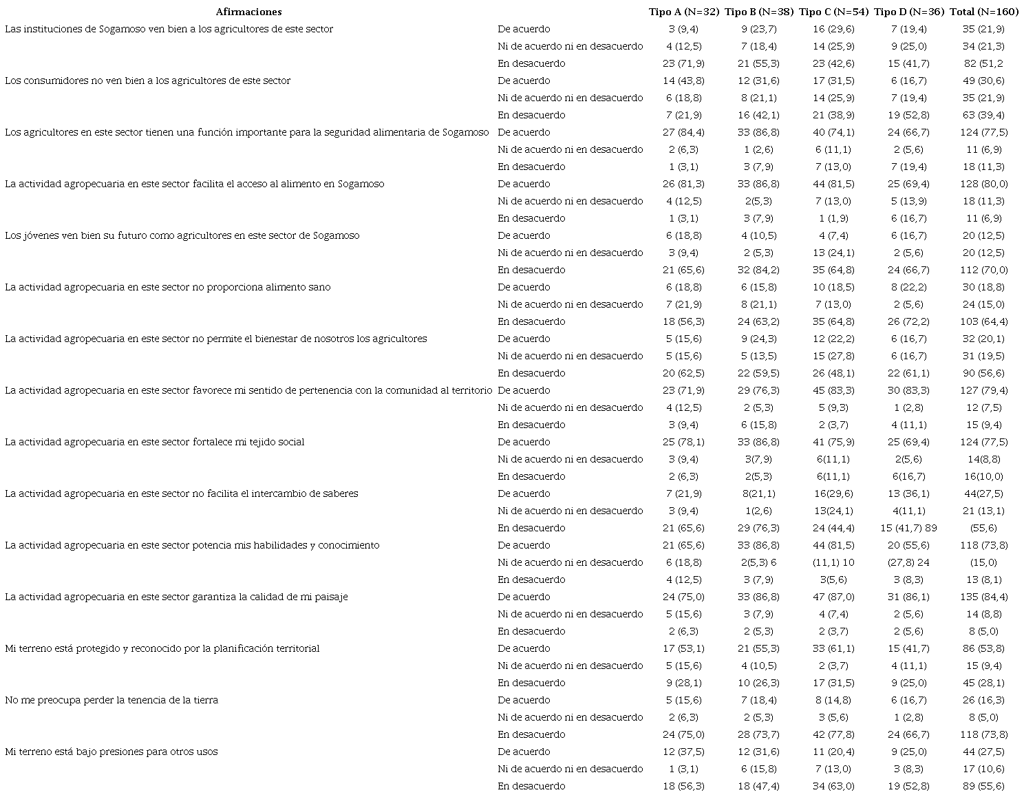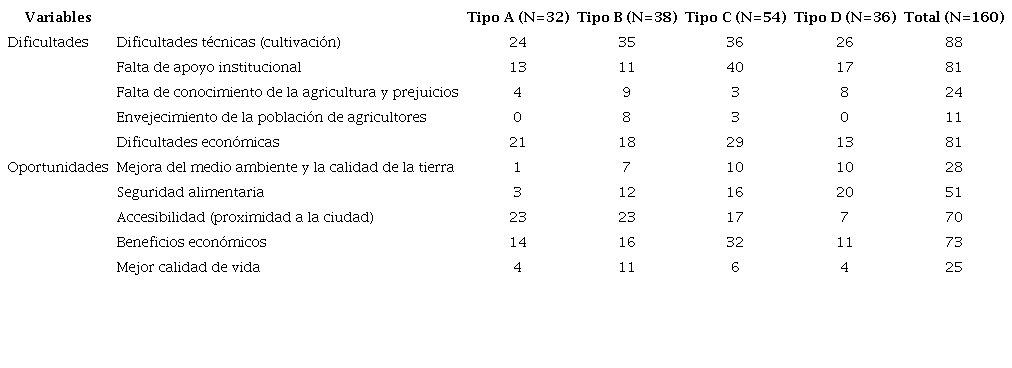 En general, los encuestados de los cuatro tipos coincidieron en afirmar que la agricultura fomenta el sentido de comunidad; sin embargo, los tipos C y D expresaron los grados más altos en relación con la contribución positiva de la APU. Del mismo modo, los agricultores compartieron la opinión de que la APU contribuye a un paisaje de calidad y refuerza los lazos sociales, mientras mejora las habilidades y conocimientos agrícolas (Cuadro 4).