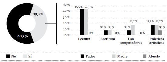 Para la mayoría de los egresados abordados en este estudio, el acceso a la educación superior fue una circunstancia novedosa en su trayectoria de vida. En 26 de los 28 casos analizados, esta fue la primera experiencia familiar en educación superior caracterizada por un débil encauzamiento educativo desde la familia, a causa de un nivel formativo bajo en las generaciones precedentes, esto es, abuelos y padres: de forma mayoritaria, los primeros cursaron solo la educación primaria o, en su defecto, ningún proceso formativo de carácter formal, y los segundos, únicamente la primaria o secundaria. Adicionalmente, se registra poca dedicación a actividades intelectuales en estas dos generaciones; en menos de la mitad de los casos (39,3 %) se reconoció la existencia regular de alguna práctica constante de este tipo en los padres: por ejemplo, menos de la mitad se dedica a la lectura (figura 1), situación que se explica por cuanto la mayor parte de ellos desempeña oficios no cualificados, al tiempo que están asentados en territorios donde no contaron con acceso a la educación superior, con lo que esta se torna en un ámbito poco o nada significativo en la consolidación de sus proyectos de vida. No obstante, la situación de los padres fue un elemento que llevó a los egresados a buscar la calificación a través de la formación universitaria, así como al cultivo de diferentes prácticas intelectuales -la dedicación a la lectura, por ejemplo-.