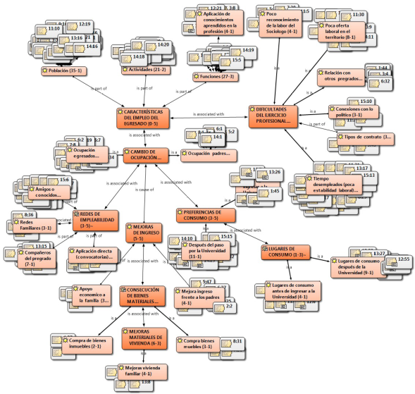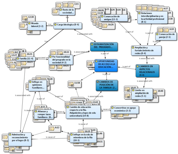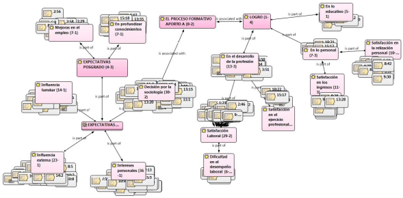 En provecho de las ventajas de la integración de métodos (Puentes-Borges; Puentes-Bencomo; Puentes-Bencomo, 2017; Alzás-García; Casa-García, 2017; Sánchez, 2015) se diseñó la guía de entrevista semiestructurada (Trindade, 2016), a partir de los resultados de la encuesta, para profundizar sobre las razones por las cuales los participantes del estudio decidieron orientarse hacia la formación profesional y cómo esta transformó su vida y la de sus familiares y personas cercanas. La guía se diseñó sobre la base de los tres momentos de la encuesta; y el análisis de la información se realizó de acuerdo con un proceso de codificación cerrado, en el cual se utilizó la técnica de redes semánticas a partir de tres categorías principales: logro personal, logro educativo y acumulación de capitales. En función de estas tres categorías se profundizó en la información relacionada con las características de las motivaciones que, para los egresados, fueron determinantes en la decisión de acceder a la educación superior y en la forma como la experiencia educativa marcó sus trayectorias familiares, educativas y profesionales. De esta manera, se ubicaron los roles que a tal respecto tuvieron la familia, los amigos, las instituciones educativas y los docentes, entre otros grupos relevantes, para identificar el impacto de la educación superior en el egresado, más allá del cumplimiento de la política pública en la región.