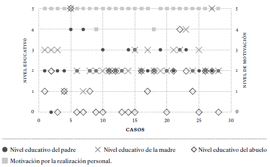 Al relacionar gráficamente la calificación de este aspecto en una escala numérica de 0 a 5 -donde 5 representaba el mayor valor de relevancia para estudiar una carrera- con el nivel educativo de los padres y abuelos para cada uno de los egresados -donde 0 corresponde a ningún grado formativo y 5 al nivel de posgrado-, se observa que la búsqueda por la realización personal no estuvo asociada a la condición académica e intelectual de la generación precedente, como se muestra en la figura 2. Es decir, se trata del deseo por lograr transformar la condición de capital cultural de origen, lo cual se configura como principal motivación. Esta situación fue posible, para los egresados, a partir de las condiciones habilitantes del entorno: esto es, la existencia de una oferta educativa accesible que viabilizó su ingreso a la educación superior, pues en casi la totalidad de los casos esto fue determinante para estudiar y obtener la titulación profesional -en otras palabras, cumplir con la aspiración de realizarse personalmente a través de la formación universitaria-.