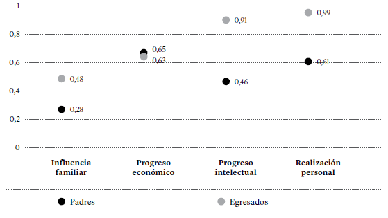 La influencia de estos grupos permitió consolidar una expectativa de realización personal a través del estudio, pues convirtió el logro educativo en la base del proyecto de vida de los ahora egresados, orientado principalmente, como se mencionó, por el deseo de progresar intelectualmente, es decir, por poseer conocimientos cualificados a través de la formación y obtener un progreso económico. Es posible contrastar esta situación con las expectativas de los padres, para quienes este último aspecto sí tenía más relevancia en el logro educativo de sus hijos, tal como se muestra en la figura 3: allí donde se presenta el promedio de calificación de los 28 casos -en una escala de 0 a 1- sobre los aspectos que tuvieron mayor importancia para los egresados y, en su opinión, para sus padres al tomar la decisión de acceder a la educación superior -donde 1 corresponde a la mayor importancia-.