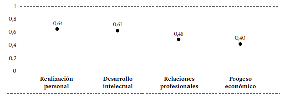 El paso por la Universidad abrió las puertas de un mundo desconocido para los egresados. Allí adquirieron nuevas experiencias, conocimientos y relaciones sociales, entre otros aspectos que los enorgullecen y los llenan de satisfacción. Hoy, desde su sentir, se consideran personas exitosas en diferentes ámbitos, sin que ello signifique sentirse plenos; no obstante, reconocen los logros obtenidos que han transformado sus vidas y la de sus familias. En promedio, el aspecto en el que refieren haber alcanzado mayor éxito -haciendo una valoración en una escala de 0 a 1, donde 1 corresponde al mayor nivel de éxito concierne a la realización personal que, desde un principio-, fue la mayor motivación en su plan de vida en relación con la educación, seguido del desarrollo intelectual (figura 4); sin embargo, de acuerdo con la calificación otorgada en la escala, el aspecto en el cual aún consideran tener mucho pendiente por lograr corresponde al progreso económico.