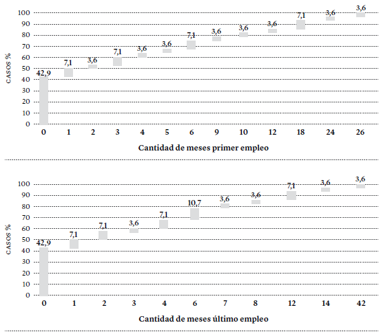 No obstante, se encontró que 53,6 % de los graduados -sumados los porcentajes de casos correspondientes a la cantidad de meses 0, 1 y 2- lograron conseguir su primer empleo en menos de 2 meses, y el 75 % en un tiempo máximo de 6 meses -sumados los porcentajes de la cantidad de meses 0 a 6- (figura 5). Esto es significativo para el campo de acción de la Sociología, dado el bajo reconocimiento a la labor y el perfil de esta profesión según la experiencia de los egresados. Así mismo, es relevante valorar la formación sociológica respecto al requerimiento de la política pública de educación superior en lo tocante al desarrollo de herramientas para el trabajo, las cuales permiten el logro ocupacional por parte de los sociólogos. Situación similar se tiene al indagar por el último o actual empleo: 57,1 % logró ocuparse en menos de 2 meses y el 78,5 % tardó 6 meses como máximo, lo que da cuenta de una dinámica significativa en la movilidad ocupacional de esta población.