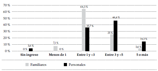 No obstante estas dificultades, los egresados manifiestan haber logrado una mejora considerable en sus ingresos económicos, al tener en cuenta que antes del acceso a la universidad estos estaban sustentados por sus núcleos familiares donde los ingresos del grupo oscilaban entre 1 y 3 salarios mínimos legales vigentes (SMLV), y que para el titulado evidenciaron una variación significativa dado que, en la misma escala de medición, los recursos devengados por la mayor parte de ellos corresponden a un monto que oscila entre 3 y 5 SMLV (figura 6). A este respecto es importante señalar que los ingresos de las familias se disponían para los gastos de todos los integrantes del núcleo familiar; mientras que en el caso de los egresados, la destinación de sus recursos se da en mayor proporción para sus gastos personales, lo cual constituye, según las narraciones de sus experiencias, una mejora significativa en sus condiciones materiales individuales y en sus hogares. Al respecto, 64,2 % manifestó apoyar de forma permanente o en muchas ocasiones a su grupo familiar de origen, mientras que 21,4 % lo ha hecho con mediana frecuencia.