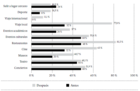 La mejora a nivel individual también se ve reflejada en las prácticas de consumo de los egresados: 39,3 % manifestó haber adquirido una vivienda, e igual porcentaje compró un vehículo. Además, se encontró un incremento en actividades de ocio como viajes (locales e internacionales) y visitas a restaurantes y cines frente a las realizadas antes de profesionalizarse (figura 7); ello cual evidencia cambios en el estilo de vida, conducentes a mejorar la posición social (Bonnewitz, 2006). Estas modificaciones, según los egresados, se deben al proceso formativo, que propició una transformación en su percepción sobre las cosas, haciéndolos personas más conscientes acerca del uso del tiempo libre como un aspecto ligado al desarrollo personal y social, el cual representa un progreso material y de las condiciones de vida no materiales.