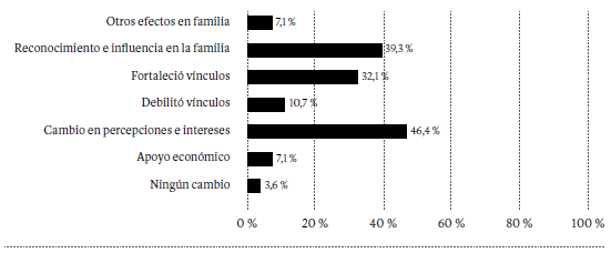 Un aspecto relevante en la narración de la experiencia de los egresados, derivado de su formación profesional, se relaciona con la ubicación como referentes para sus familias en diferentes dimensiones. Recopilan y entretejen elementos de su experiencia personal para dirigir y motivar los procesos educativos de otros integrantes de su núcleo de crianza; por ejemplo, narraron que primos o hermanos se han visto alentados a emprender y terminar la formación superior universitaria. Además, debido a los conocimientos que adquirieron en Sociología, quedaron acreditados para dar opiniones y orientar decisiones de todo tipo dentro de este mismo ámbito (figura 8). Esto se traduce en el fortalecimiento de vínculos para el 32,1 % de los casos, aunque durante la carrera haya significado choques y rompimientos debido a las posiciones encontradas frente a creencias religiosas, políticas y hábitos de vida representados en los cambios de percepciones e intereses, lo cual fue reconocido por el 46,4 % de la población abordada.