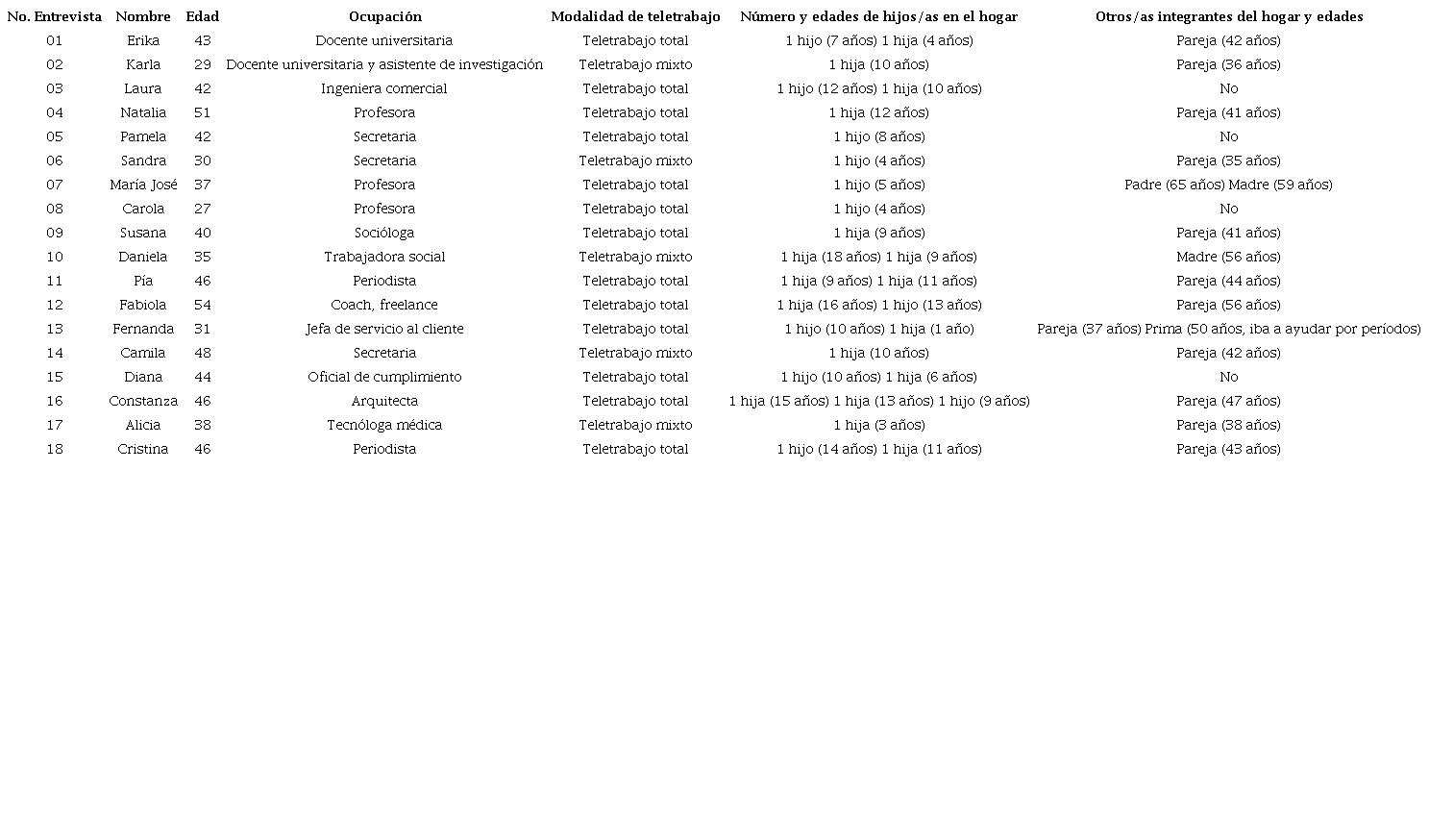 Se estableció un muestreo intencional (Izcara, 2007) de mujeres con trabajo estable en modalidad de teletrabajo por la pandemia, con diversidad de ocupaciones e ingresos, siendo la mayoría profesionales de clase media alta, aunque también se incluyeron mujeres trabajadoras del área de servicios. Se entrevistaron mujeres del sector educativo (profesoras de enseñanza básica, media y universitarias); secretarias; profesionales del área empresarial, del comercio y finanzas; profesionales del sector público, y periodistas. Todas las entrevistadas son madres de hijos/as de hasta 14 años y viven con ellos/as. Sus nombres han sido cambiados para proteger su identidad. Las principales características de las entrevistadas se incluyen en el Cuadro 1.