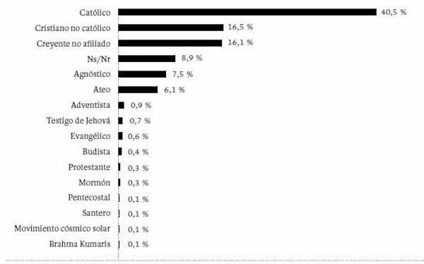 Solo el 40,5 % de los jóvenes se reconocen como católicos; este dato gana relevancia si se tiene en cuenta que el 75 % del total de los consultados fue bautizado según el rito católico. Además, menos de la mitad (43 %) de quienes se identifican como católicos asiste a misa con alguna regularidad (semanal o mensual), y solo la mitad de ellos optaría por una ceremonia religiosa a la hora de formalizar una relación de pareja. Estos datos pueden ser interpretados como evidencias del debilitamiento de la tradición católica entre la población joven.