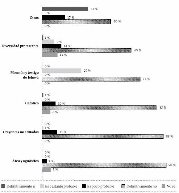 Revisando esta misma pregunta por sexo e identidad de género, se observan valores similares en los tres grupos analizados (hombres heterosexuales, mujeres heterosexuales y población LGBTIQ). En todos los casos, el 80 % o más de los consultados afirman que definitivamente no seguirán una carrera como religiosos/ as. Sin embargo, el 3 % de las mujeres heterosexuales considera que es bastante probable que opten por una carrera como religiosas, mientras que solo el 2 % de los hombres heterosexuales y ningún miembro de la población LGBTIQ contemplan esta opción. Llama la atención que las mujeres que afirman que con absoluta certeza seguirán esta opción profesional hacen parte del movimiento evangélico pentecostal, movimiento que muestra mayor apertura al liderazgo religioso femenino, si se lo compara con la Iglesia católica.