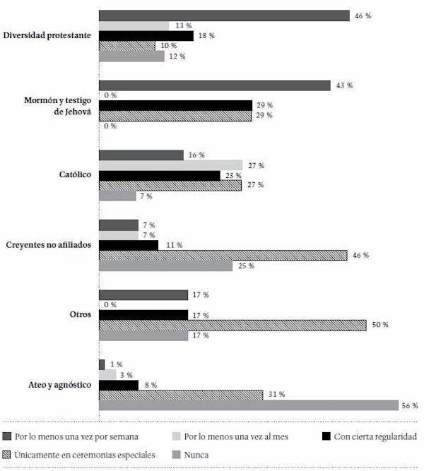 Al ser consultados por la frecuencia con que asisten a servicios religiosos (como misas o cultos), el 17 % de los estudiantes dijo asistir a estos ritos semanalmente; el 15 %, por lo menos una vez al mes; el 17 %, unas pocas veces al año; el 29 %, solo en ceremonias especiales (como matrimonios o funerales); y el 20 %, nunca.