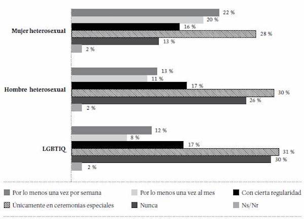 La frecuencia con la que los jóvenes asisten a servicios religiosos varía según la identidad de género. En la población heterosexual, la frecuencia de asistencia semanal y mensual de las mujeres a estos servicios casi duplica la de los hombres. En la población LGBTIQ, se observa la menor frecuencia de asistencia a servicios religiosos. Además, en esta población se registra el porcentaje más alto de personas que nunca asisten a este tipo de ritos (30 %) (Figura 12).