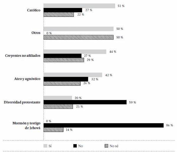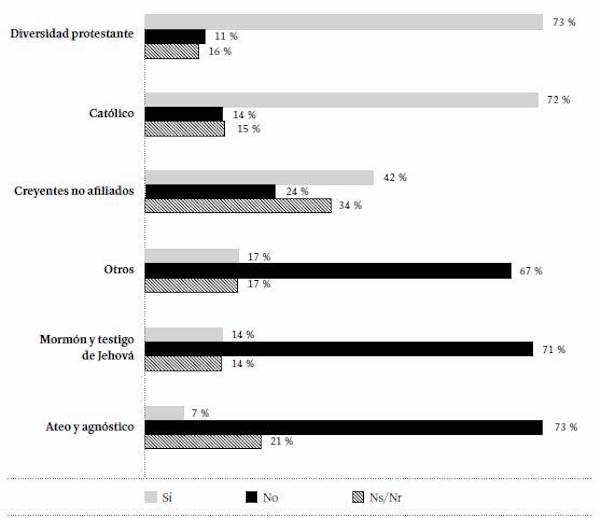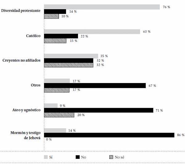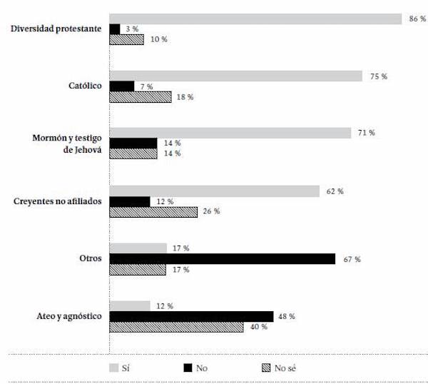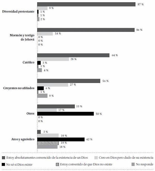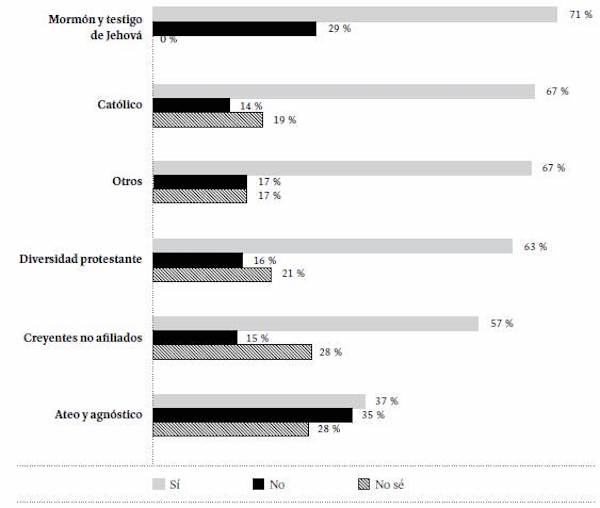 La creencia en la existencia de Dios varía según la afiliación religiosa (Figura 13). Entre los protestantes (en sus diversas ramas), testigos de Jehová y mormones se registran los porcentajes más altos de quienes afirman estar absolutamente convencidos de la existencia de Dios (87 y 86 %, respectivamente). Entre quienes se identifican como católicos, esta cifra desciende al 64 %; y entre los creyentes no afiliados a ninguna religión, al 56 %. Llama la atención que el 3 % de quienes se identifican como ateos o agnósticos afirmó estar absolutamente convencido de la existencia de Dios, mientras que 19 % de ellos cree en Dios, pero duda de su existencia.