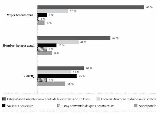 Al desagregar la creencia en Dios por sexo e identidad de género, se evidencia que la convicción en torno a este tema es más frecuente entre las mujeres heterosexuales (68 %), porcentaje que desciende al 47 % entre los hombres heterosexuales, y al 30 % entre la población LGBTIQ. En este último grupo, aumentan los porcentajes de quienes dudan de la existencia de Dios o tienen la certeza de que Dios no existe (Figura 14).