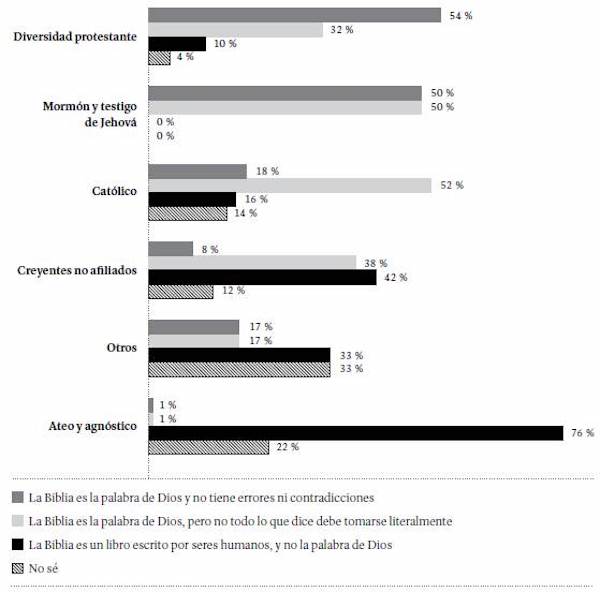 A la pregunta "Sobre la Biblia, escoja la afirmación con la que coincide o la que más se acerca a su posición...", la opción predominante fue que la Biblia es la palabra de Dios, pero no todo lo que dice debe tomarse literalmente (36 %), seguida por la Biblia es un libro escrito por seres humanos, y no la palabra de Dios (28 %), y, en último lugar, la Biblia es la palabra de Dios y no tiene errores ni contradicciones (20 %). El 16 % de los estudiantes no respondió la pregunta o dijo no conocer la respuesta.