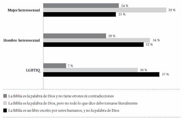 Al analizar la opinión de los estudiantes sobre la Biblia, por identidad de género (Figura 21), se observa que la opción la Biblia es la palabra de Dios, pero no todo lo que dice debe tomarse literalmente fue predominante entre mujeres y hombres heterosexuales (39 y 34 %, respectivamente), mientras que la opción la Biblia es un libro escrito por seres humanos, y no la palabra de Dios fue predominante entre las personas LGBTIQ(37 %).