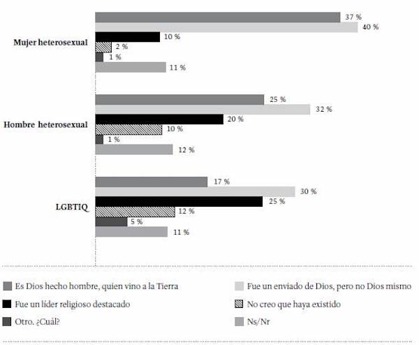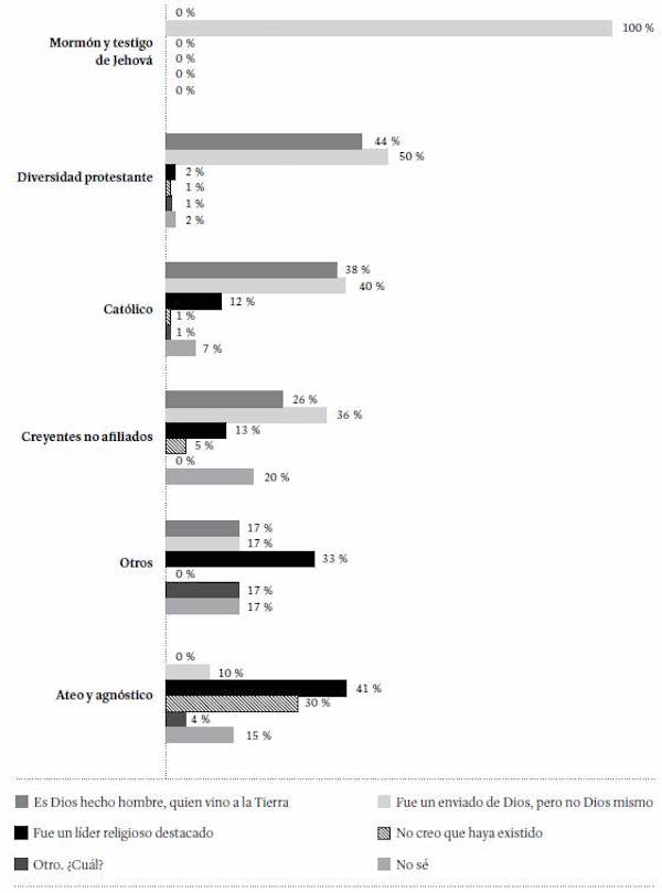 Al desagregar estas respuestas según la identidad religiosa de los estudiantes, se observa que la totalidad de los mormones y los testigos de Jehová, y la mitad de los protestantes (en sus diversas corrientes) optaron por la respuesta: fue un enviado de Dios, pero no Dios mismo. Esta respuesta también fue predominante entre los católicos y los creyentes no afiliados a ninguna religión (40 y 36 %, respectivamente). Entre ateos y agnósticos, y los adherentes a otras religiones, predomina la opinión según la cual Jesús de Nazaret fue un líder religioso destacado (41 y 33 %, respectivamente) (Figura 22).