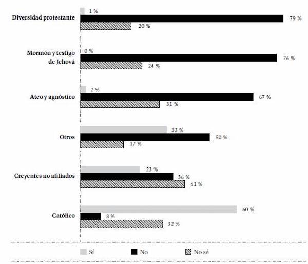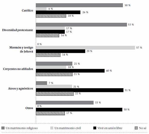 A la pregunta "Si usted llegase a formalizar una vida en pareja, preferiría: a) un matrimonio religioso, b) un matrimonio civil, c) vivir en unión libre", el 36 % optó por el matrimonio religioso, el 32 % prefirió la unión libre, el 13 % eligió el matrimonio civil; y el 19 % no respondió la pregunta. Al desagregar estas respuestas por la identidad religiosa (Figura 8), se observa que la mitad de los católicos y un poco más de la mitad de los protestantes prefieren el matrimonio religioso; la mayoría de los mormones y de los testigos de Jehová prefieren el matrimonio civil; mientras que entre ateos, agnósticos y creyentes no afiliados predomina la unión libre.