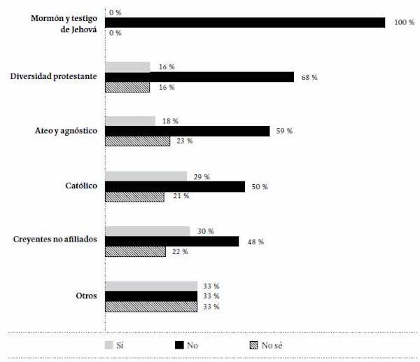 A la pregunta "¿Usted cree en la vida después de la muerte?", el 59 % de los encuesta-dos respondió afirmativamente; el 17 %, de manera negativa, y 24 % dijo no saber o no respondió a la pregunta. Al desagregar estas respuestas según la identidad religiosa de los encuestados (Figura 16), se observa que el porcentaje de jóvenes que cree en la vida después de la muerte aumenta entre mormones y testigos de Jehová, donde alcanza el 71 %, seguido por los católicos y los adherentes a otras religiones. Llama la atención que entre ateos y agnósticos es levemente mayor el porcentaje de quienes creen en la vida después de la muerte que el de quienes no mantienen esta creencia.