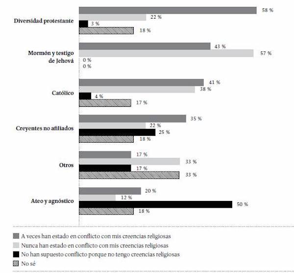 Por último, 38 % de los jóvenes manifiesta haber tenido conflictos subjetivos relacionados con las tensiones entre sus creencias religiosas y aquellas basadas en las explicaciones científicas. En este aspecto, los protestantes (en sus diversas corrientes), más que cualquier otro grupo religioso, manifiesta haber experimentado este tipo de conflictos. Los aspectos que más alimentan estas contradicciones se relacionan con el papel de Dios en el origen y evolución de la vida, y en el origen y en la evolución de la especie humana. Uno de cada 4 jóvenes manifestó su adhesión a la tesis creacionista: Dios creó directamente la vida. Sin embargo, entre los protestantes, mormones y testigos de Jehová, esta posición es mayoritaria. Por otro lado, menos de la mitad de los jóvenes (45 %) considera que la especie humana es producto de la evolución por selección natural, y cerca del 30 % de los consultados considera que la especie humana existe gracias a alguna forma de intervención divina (ya sea por creación o por una evolución que obedece a un diseño inteligente). Estas posturas también gozan de mayor acogida entre los protestantes, mormones y testigos de Jehová. En el contexto colombiano, y especialmente en el escenario de la educación escolar, los conflictos entre ciencia y religión han sido poco estudiados. Por lo tanto, también en este asunto se requieren nuevas investigaciones que permitan comprender las implicaciones de las tensiones entre ciencia y religión.