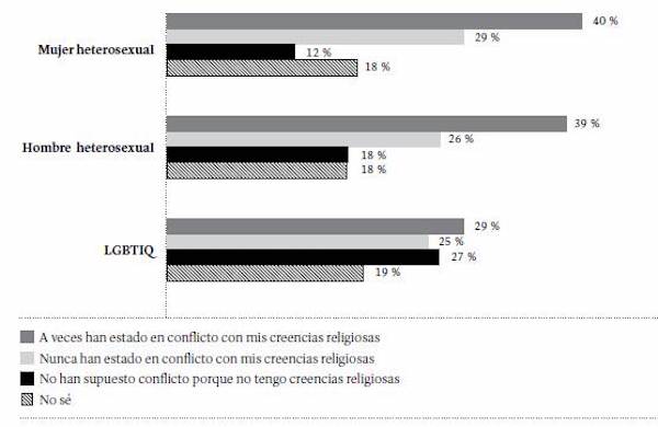 Al desagregar las respuestas a la pregunta sobre los posibles conflictos entre ciencia y religión por la identidad de género de los estudiantes, sobresale que este tipo de conflictos son más frecuentes en la población heterosexual (Figura 27).