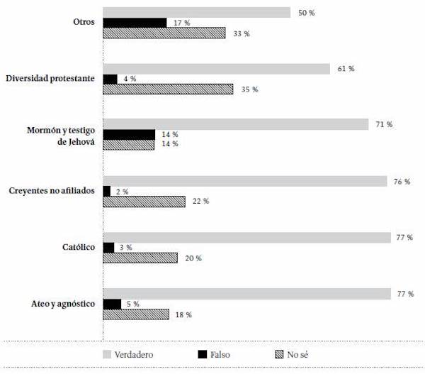 A la pregunta "¿Consideran verdadero o falso el enunciado: el universo existe hace miles de millones de años y se encuentra en constante transformación?", el 72 % respondió que lo consideraba verdadero; el 3,7 %, que es falso; el 24,3 % no respondió o dijo no conocer la respuesta. Al desagregar estas respuestas por la identidad religiosa (Figura 29), sobresalen los ateos/agnósticos y los católicos, que encabezan el listado de quienes consideran verdadera esta afirmación (con un 77 %), seguidos por los creyentes no afiliados con un porcentaje similar (76 %).