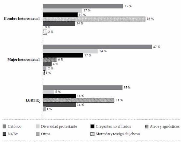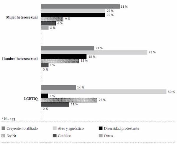 La filiación religiosa varía según el sexo y la identidad de género. Para identificar este aspecto, se dividió la población estudiada en 3 grupos: hombre heterosexual, mujer heterosexual y población LGBTIQ (lesbiana, gay, bisexual, transexual, intersexual y queer). Al comparar hombres y mujeres heterosexuales, se observa que entre las mujeres aumenta el porcentaje de quienes se identifican como católicas o con alguna vertiente del protestantismo; mientras entre los hombres aumentan los porcentajes de quienes se identifican como ateos/agnósticos. Por su parte, en la población LGBTIQ, un menor porcentaje se identifica con las vertientes del protestantismo, y aumentan, de manera notoria, las personas que se identifican como ateas o agnósticas (31 %) (Figura 3).