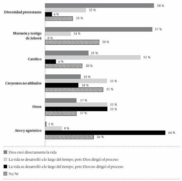 A la pregunta sobre el origen de la vida, el 25 % de los estudiantes optó por la opción Dios creó directamente la vida; el 33 % se inclinó por la vida se desarrolló a lo largo del tiempo, pero Dios dirigió el proceso; y el 18 %, por la vida se desarrolló a lo largo del tiempo, pero Dios no dirigió el proceso. El 24 % manifestó no saber o no respondió la pregunta. Al desagregar estas respuestas según la identidad religiosa de los estudiantes, se observa que la creencia en que Dios creó directamente la vida es más frecuente entre los protestantes (en sus diversas vertientes) (58 %) y entre los testigos de Jehová y mormones (57 %); mientras que la posición según la cual la vida evolucionó sin la ayuda de Dios es más frecuente entre ateos y agnósticos (64 %) (Figura 30).