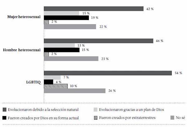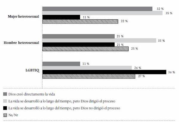 Al analizar las respuestas sobre la intervención de Dios en el origen y evolución de la especie humana, con respecto a la identidad de género (Figura 33), se observa que en todos los casos es predominante la creencia en la teoría de la evolución por selección natural, pero es más frecuente entre las personas LGBTIQ(54 %) y entre los hombres heterosexuales (46 %). Mientras que la explicación creacionista (los seres humanos fueron creados por Dios en su forma actual) aumenta su frecuencia entre las mujeres heterosexuales (19 %).
