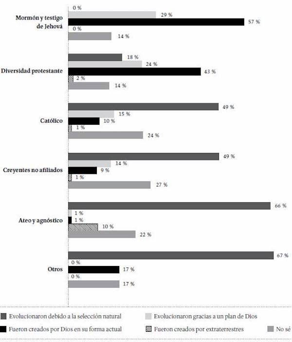 A la pregunta sobre el origen de los seres humanos, el 45 % de los consultados considera que evolucionaron debido a la selección natural de las especies; el 13 %, que evolucionaron gracias a un plan de Dios; el 16 %, que fueron creados por Dios en su forma actual; y el 3 %, que fueron creados por extraterrestres. El 23 % no respondió la pregunta o marcó la opción no sé. Al desagregar estas respuestas por la identidad religiosa de los estudiantes, se observa que, entre ateos y agnósticos, y entre los adherentes a las religiones agrupadas en otros, es más frecuente la opinión según la cual la vida evolucionó gracias a la selección natural de las especies (66 y 67 %, respectivamente); mientras que, entre mormones, testigos de Jehová y adherentes a las diversas corrientes protestantes es más frecuente la posición según la cual los seres humanos fueron creados por Dios en su forma actual (creacionismo bíblico) (Figura 32).