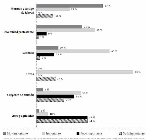 Al interrogar a los estudiantes sobre la importancia de la religión en sus vidas, el 17 % afirmó que la religión es muy importante; el 45 % dijo que es importante; el 23 %, que es poco importante; y el 14 %, que no importa en absoluto. Por identidad religiosa, entre aquellos que se identificaron como mormones, testigos de Jehová y los protestantes en sus diversas vertientes, aumenta el porcentaje de quienes consideran que la religión es muy importante en sus vidas, si se los compara con los católicos. Entre los creyentes no afiliados, ateos y agnósticos aumenta el porcentaje de quienes consideran que la religión es poco importante o no importa en absoluto (Figura 5).