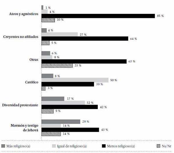 Frente a la pregunta "¿En comparación con sus padres o acudientes, indique qué tan religioso usted se considera (más, menos o igual de religioso)?", el 52 % de los consultados respondió que se consideraban menos religiosos que sus padres o acudientes. Al desagregar esta información de acuerdo con la identidad religiosa de los estudiantes (Figura 6), en todos los casos la opción predominante fue menos religioso, con la sola excepción de los católicos, entre quienes la opción predominante fue igual de religioso que mis padres o acudientes.