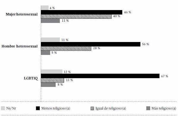 La importancia subjetiva de la religión también varía con el sexo y la identidad de género. En la población heterosexual, el 71 % de las mujeres consideran que la religión es importante o muy importante en sus vidas, frente al 58 % de los hombres. En la población LGBTIQ, solo el 42 % considera que la religión es importante o muy importante, mientras que la mayoría (58 %) afirma que la religión es poco importante o no importa en absoluto.