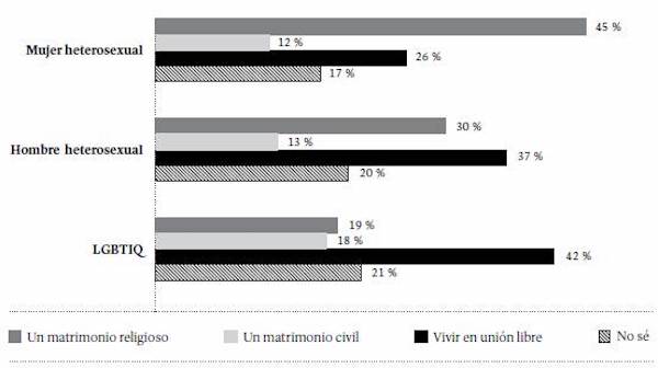 Al desagregar por sexo y orientación sexual las preferencias en lo referente a la formalización de la vida en pareja, se observa que entre las mujeres heterosexuales aumenta la preferencia por el matrimonio religioso (45 %), si se la compara con los demás grupos. Entre la población LGBTIQ y los hombres heterosexuales, la opción más marcada fue la unión libre (Figura 9).