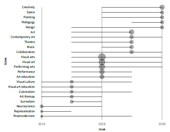 Meanwhile, the results of this bibliometric analysis reveal how topics related to visual and performing arts have transformed over the years. Topic identification was made through the trend analysis technique based on keywords (Wang; Cheng; Lu, 2014). Thus, variation between 2016 and 2020 is shown. In the former year, a higher trend toward topics related to neuroscience, postmodernism, and representation is shown, whereas, in the latter, topics such as pedagogy, creativity, space, painting, and design are emphasized. Moreover, Figure 10 shows the topic evolution in terms of arts and visual arts as well as how words such as ekphrasis and love have transcended.