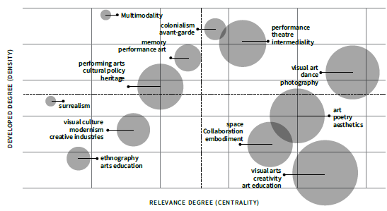 Figure 10 shows the trending topics over the years in contrast to Figure 9 which shows these topics' evolution, emphasizing topics highlighted over the last five years concerning visual and performing arts. Figure 11 shows a thematic map with four important sets of topics addressed in this research. The map is divided into four quadrants, each representing an important topic. The first quadrant shows central topics-the main topics of the research-while the second quadrant shows peripheral topics related to the main ones, but these do not have a strong presence. The third quadrant illustrates emerging or declining topics. Finally, the fourth quadrant reveals the basic topics and topics cross-sectional to the research.