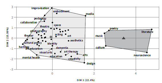 A cloud made up of words can be seen as a result of the search. This cloud organizes the most relevant words of the research by cluster. Clearly, the terms visual art and performing art present the highest content compared to the rest of the keywords found in the documents. Other words such as creativity, educational art, performance, art, music and more are emphasized (see Figure 2).
