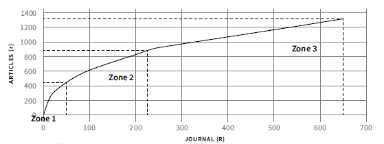 Bradford's law was used in relation to the assessment of the journals distribution. This law allows to estimate the number of available articles on a topic during a specific time and identifying production per area. This is presented through a semi-logarithmic graph showing the total of articles accrued R (n) in relation to the number of journals n, where the most productive sources are contained in the core or initial nonlinear area of the curve. It is necessary to be precise concerning the total number of sources and articles for the estimation to be useful (Praunlich; Kroll, 1978). It has been previously proven that this law is provable even when observing the behavior of emerging fields during the first stages (Peritz, 1990).
