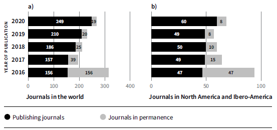 A graphic representation of the number of journals published each year and the number of journals that keep publications in contrast to years before is made considering journals that have published articles in 2016. Figure 4 shows this relationship with journals at a global scale and how this works in the North American and Ibero-American regions.