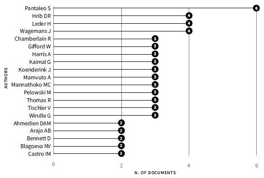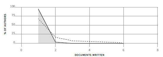 Lotka's productivity index, which represents the decimal logarithm of the number of publications groups small producers having only one work published and an index equal to 0; medium producers (2-9 published works) having a Lotka's law between 0 and 1; and large producers (10 or more works published), having a productivity index equal to or greater than 1. Such index is shown in Figure 8.