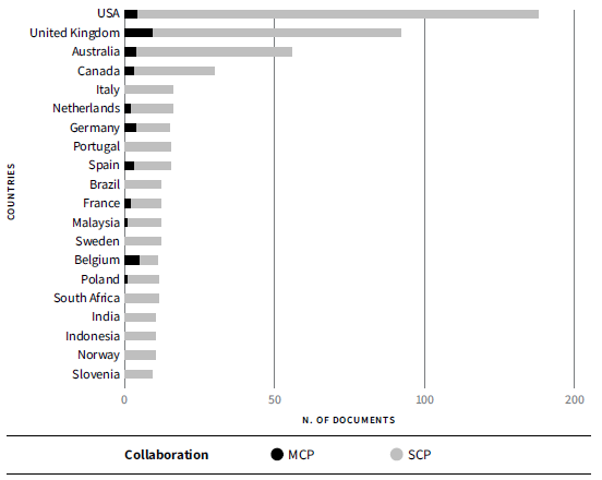 Furthermore, another factor that seems to be affecting the level of production in the categories of visual and performing arts in Scopus is IC. Results obtained from this study show the need to foster cooperation between countries because most publications are the result of local instead of IC (see Figure 5). There is a high trend for collaboration between the United States, Canada, and Germany. Simultaneously, the United States cooperated with Spain, which cooperated with France, Canada, and the United Kingdom. Collaboration between countries is rare, and there is no evidence of Latin American countries' participation. It is important to emphasize that the citation index of publications with IC is higher in contrast to that of publications lacking IC (De Moya-Anegón; Guerrero-Bote; Lopez-Illescas; Moed, 2018). Similarly, results reveal that an influential component in documentary production is the lack of productiveness exhibited by large territories, such as the African continent and Russia.