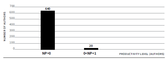 Lotka's productivity indices (n) are distributed between three productivity levels, according to the data presented in the last column in Table 2. Productivity levels or indices (PL) can be clearly seen in Figure 7, where 640 (97 %) authors have PL = 0 (low productivity) appearance. Meanwhile, there were 20 (3.0 %) authors having 0 < PL < 1 (medium productivity). The total number of authors found in the 373 articles that have been published was 660.